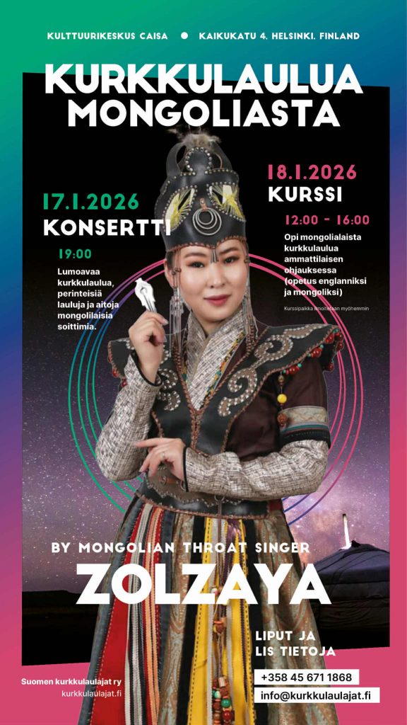 Tammikuussa kurkkulaulaja Zolzaya saapuu Suomeen Rowan Hartsuikerin kanssa. Konsertti 17.1. ja kurssi 18.1.2026. Katso tarkemmin ajankohtaista-osiosta.