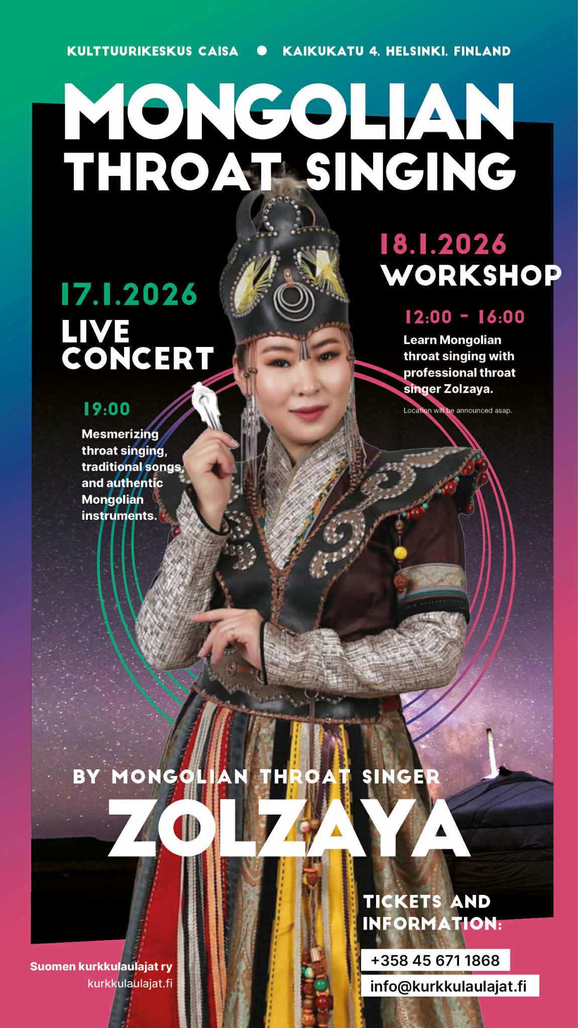 Sunnuntaina 18.1. mongolialaisen kurkkulaulun kurssi klo 12–16 Laurinniityn leikkipuiston tilassa Pohjois-Haagassa. Ainutlaatuinen tilaisuus saada opetusta mongolialaiselta huippuammattilaiselta. Kurssikieli on englanti, tulkkina Rowan Lee Hartsuiker.